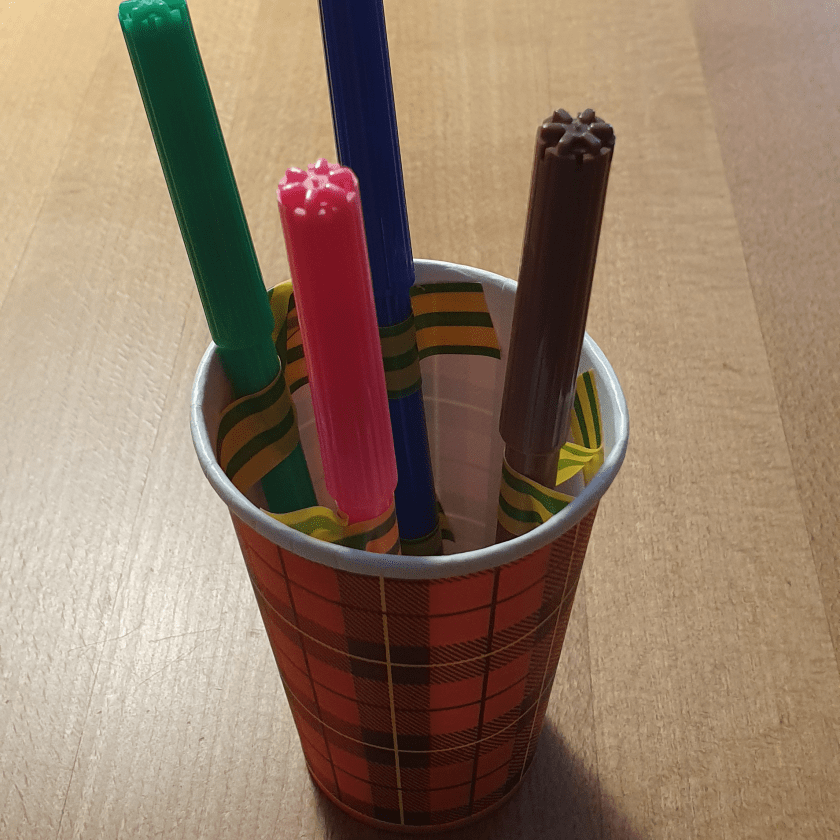 Vorige afbeelding Volgende afbeelding 20190723_075644-a Beker met vier viltstiften, stevig vastgeplakt